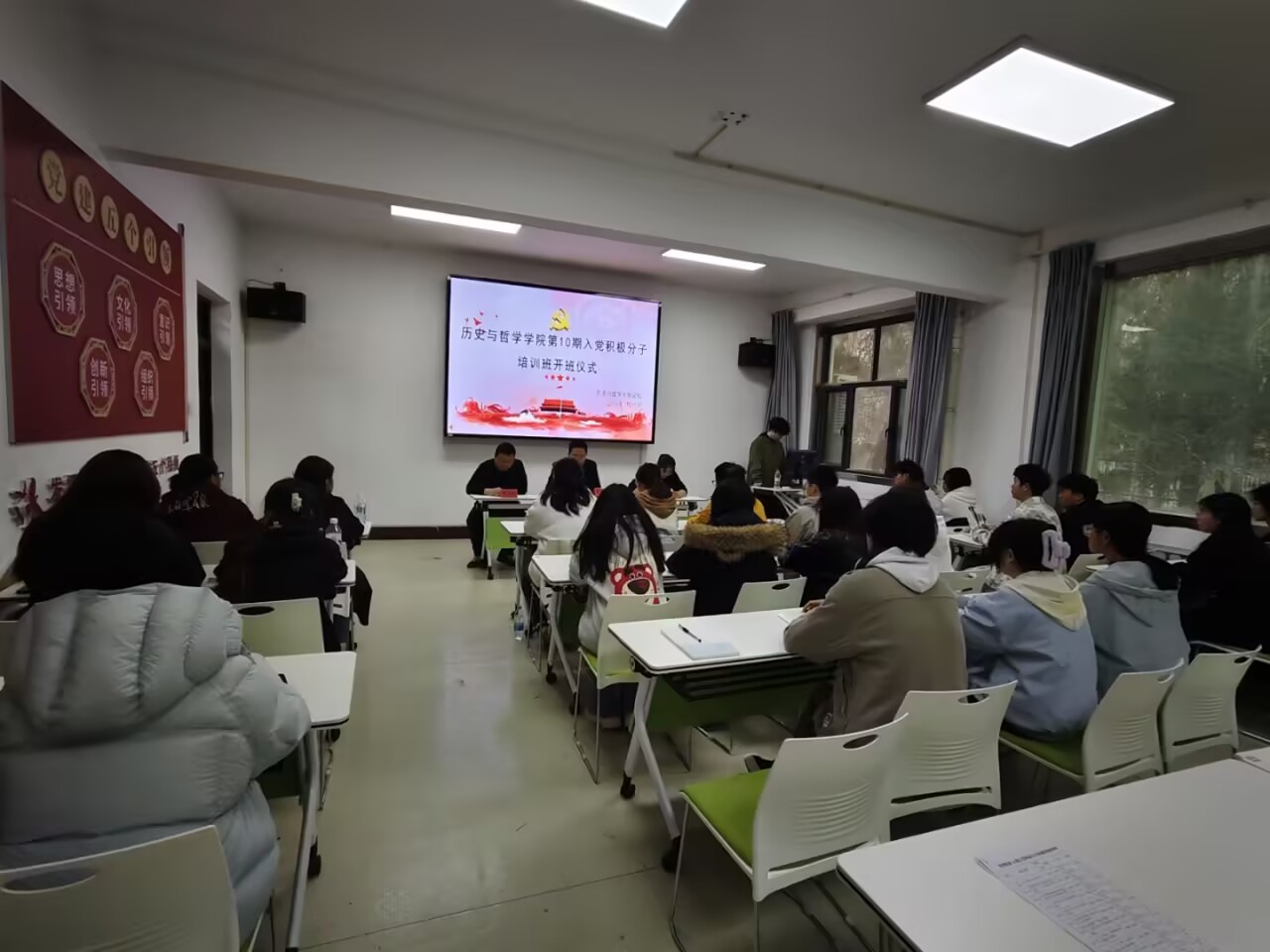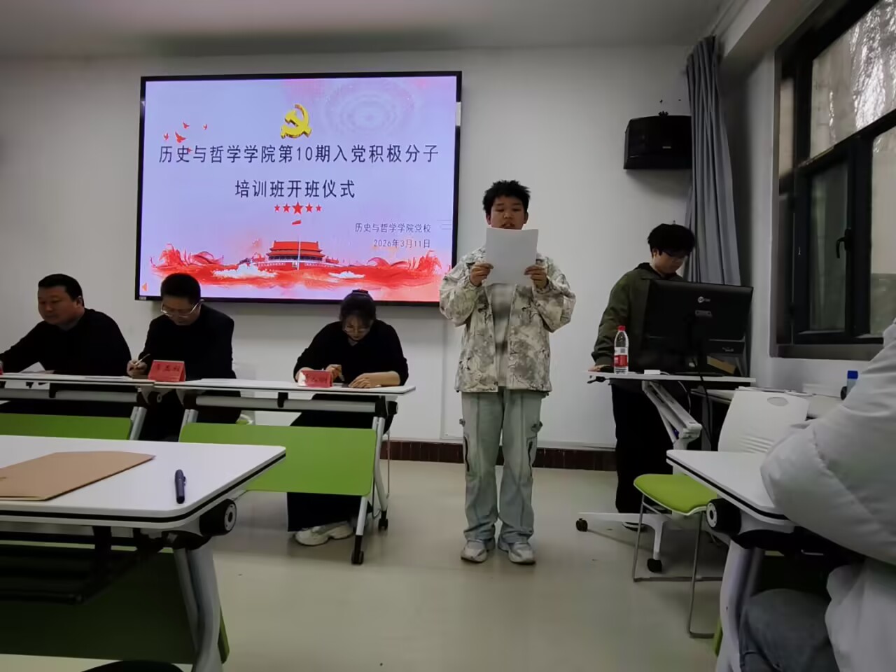为深入学习贯彻习近平新时代中国特色社会主义思想,严把党员发展“入口关”,切实加强入党积极分子思想淬炼、政治历练、理论武装,历史与哲学学院2026年入党积极分子培训班开班仪式于院楼204会议室举行。学院党委副书记常玉柱,团委书记、学生党支部书记狄云丽,党政办主任张煜辉以及本期入党积极分子参与开班仪式。