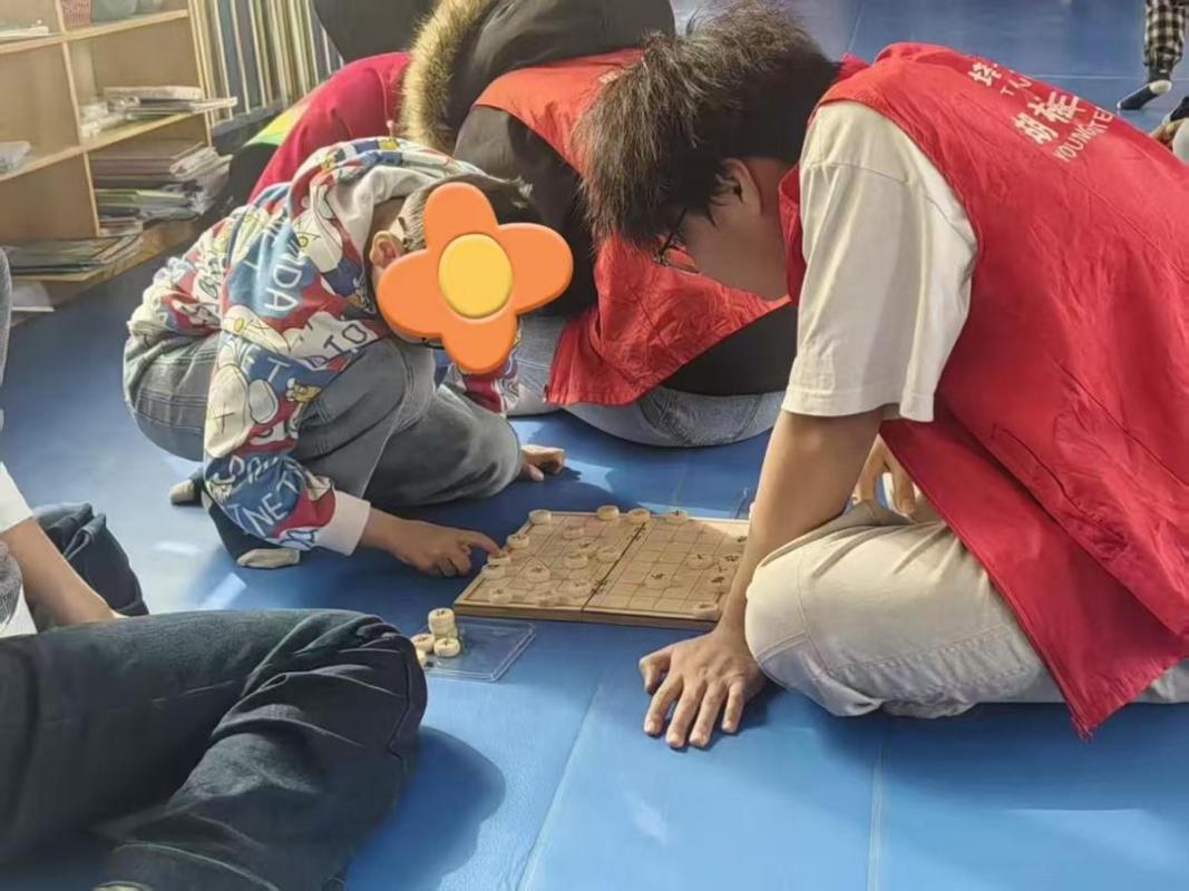 (图2:志愿者在陪儿童下象棋)