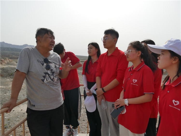 图为指导老师贾东为团队成员讲解苏巴什佛寺的地理环境。中国青年网通讯员 王泳琪 摄