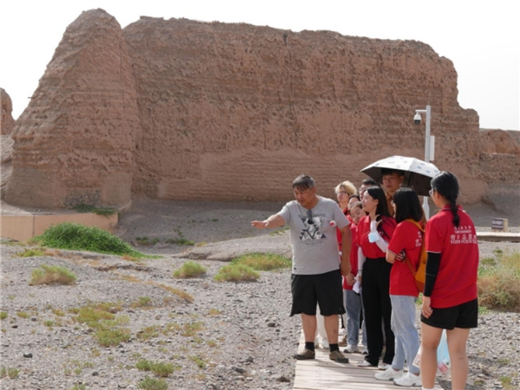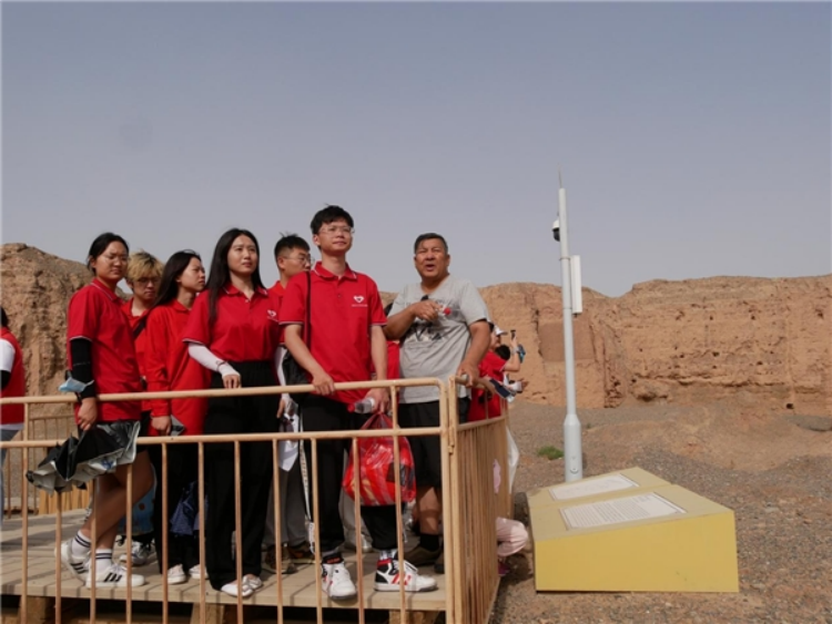 图为团队指导老师贾东带领团队成员参观苏巴什佛寺。中国青年网通讯员 李双凤 摄